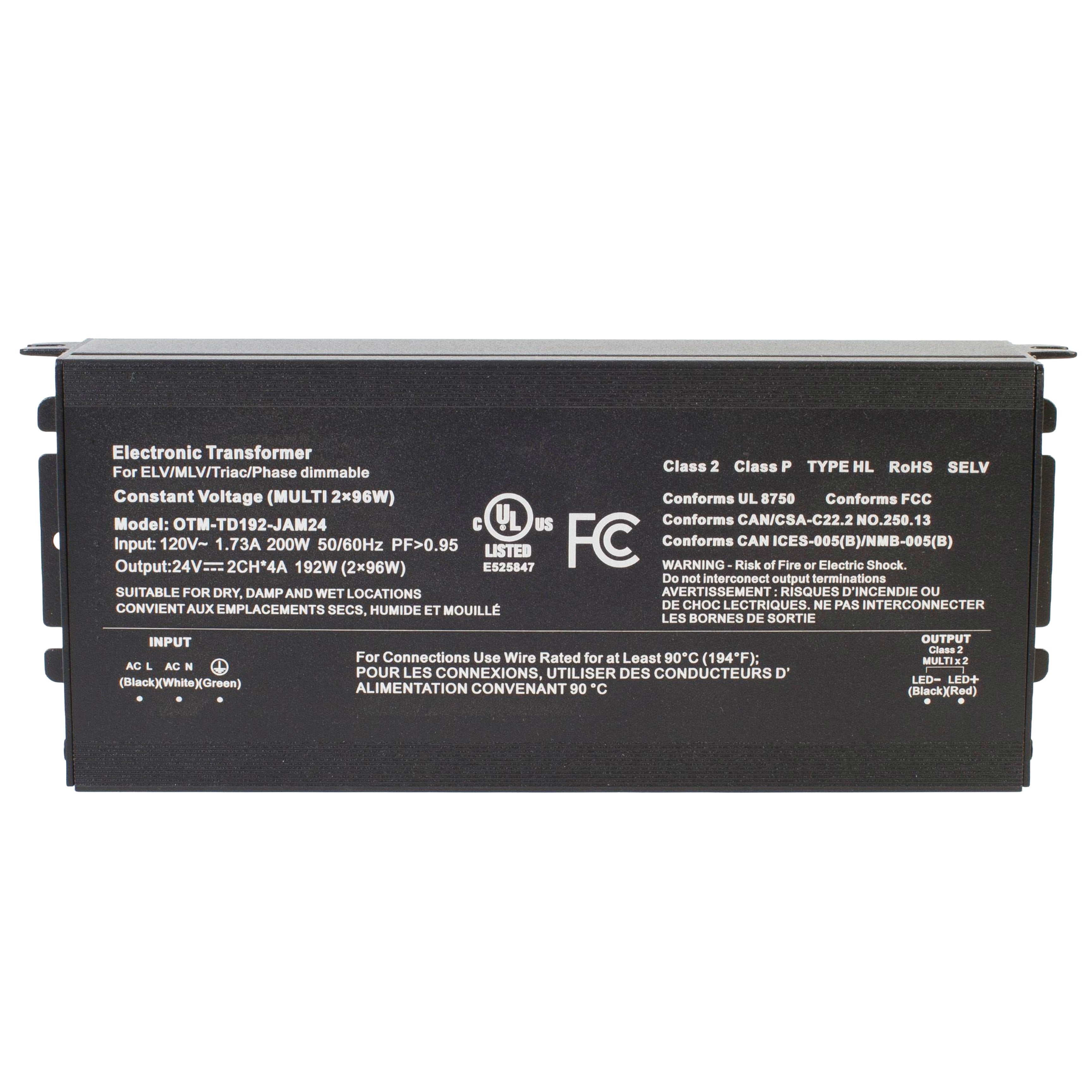 This UL-listed 24V 192W (96W x 2) Triac electronic dimmable LED driver features a compact design with two independent 96W outputs, meeting Class 2 standards. It supports a wide range of AC wall dimmers, including Lutron and Leviton, making it ideal for LED strip lights, puck lights, and module lighting. Engineered for silent operation, it eliminates buzzing or humming, ensuring a smooth and reliable dimming experience.